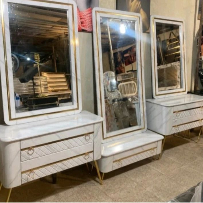 دکور آرایشگاهی بادوام و شیک قابل در رنگهای مختلف پایه فلزی آبکاری شده ارسال به با تیپاکس وباربری ست دارای سه عدد کنسول و سه عدد آینه و سه عدد قاب آینه میباشد بسیار شیک مناسب برای سالن های آرایش و آدرس:تهران،نعمت آباد،خیابان نور،کوچه یازدهم،پلاک ۲۵ فروش صفر تا صد تجهیزات آرایشگاهی با بهترین کیفیت و منصفانه ترین قیمت ارسال به شهرستان ها بدون آینه به شهرستان ها فقط کنسول و قاب آینه میباشد و هزینه آینه از محصول کسر میشود ارسال فقط به تهران و حومه با آینه میباشد خرید مستقیم از تولید کننده بدون واسطه تولید و پخش صفر تا صد تجهیزات و دکوراسیون آرایشگاهی امکان خرید حضوری و آنلاین شماره تماس:09965428596 باتشکر مدریت گالری آداک.